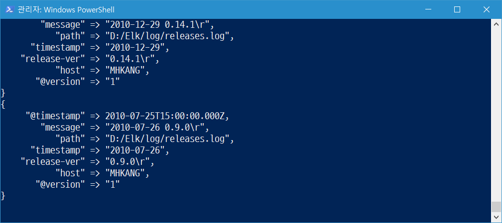 수정하니 아무런 에러도 뜨지 않고 잘 되는 줄 알았으나(..) 이번엔 로그를 읽어오지 않는다. 혹시나 싶어 로그 경로를 'path => "D:\Elk\log\releases.log"'에서 'path => "D:/Elk/log/releases.log"'로 수정하니 잘 됨. 이건 리눅스 환경으로 통일?