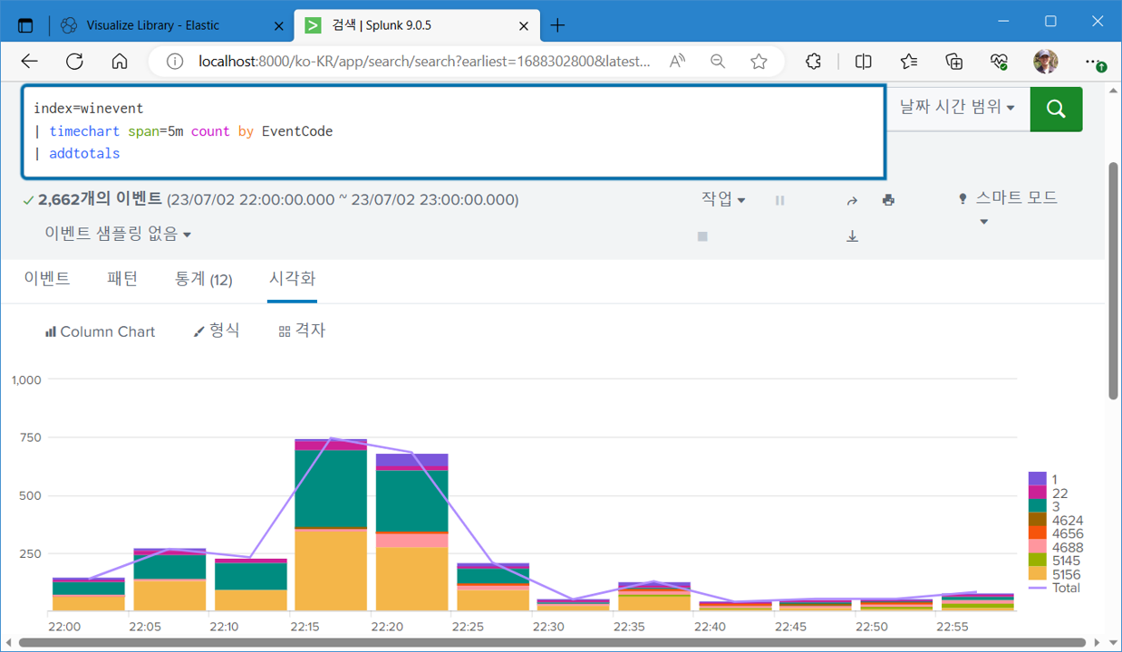다음은 키바나 Lens를 이용한 누적 세로 막대 차트. 이벤트별 발생량을 확인할 수 있다.